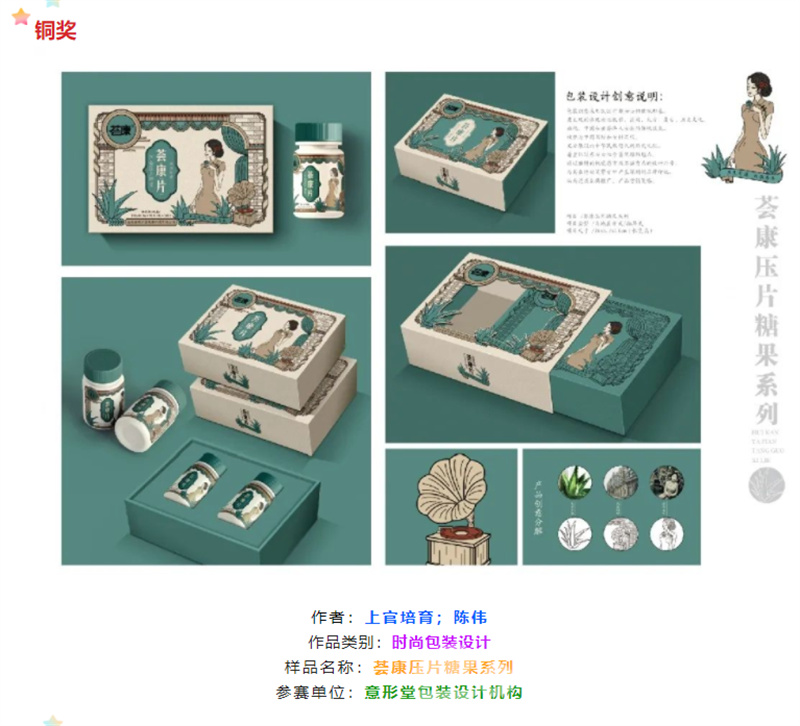 在去年的比赛中,“意形堂”投稿的荟康芦荟压片糖果高端礼盒成功拿下铜奖。据了解,该包装受山西澳意芦荟生物科技有限公司委托,荟康系列产品的特性就是专为女性而研发,关注女性健康。