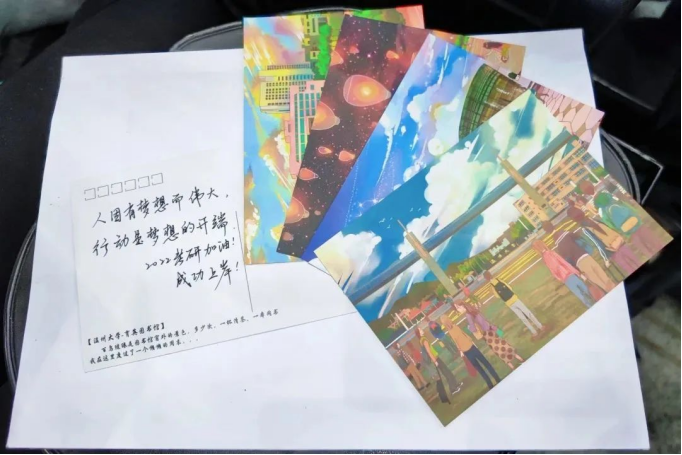 2022年11月26日上午,beat365网页版登录官网学生党员开展“暖心祝福,艺研为定”活动,每位党员将自己的祝福语写在精美的贺卡上,“星光不负赶路人,你定会在清晨的读书声里和深夜的灯光下,实现自己的梦想。”一笔一划,一字一句,明信片虽小,但每一张祝福语都承载着党员们以及美院师生们对考研同学的深深关切,相信美院备考同学们带着师生们的祝福,一战上岸!
