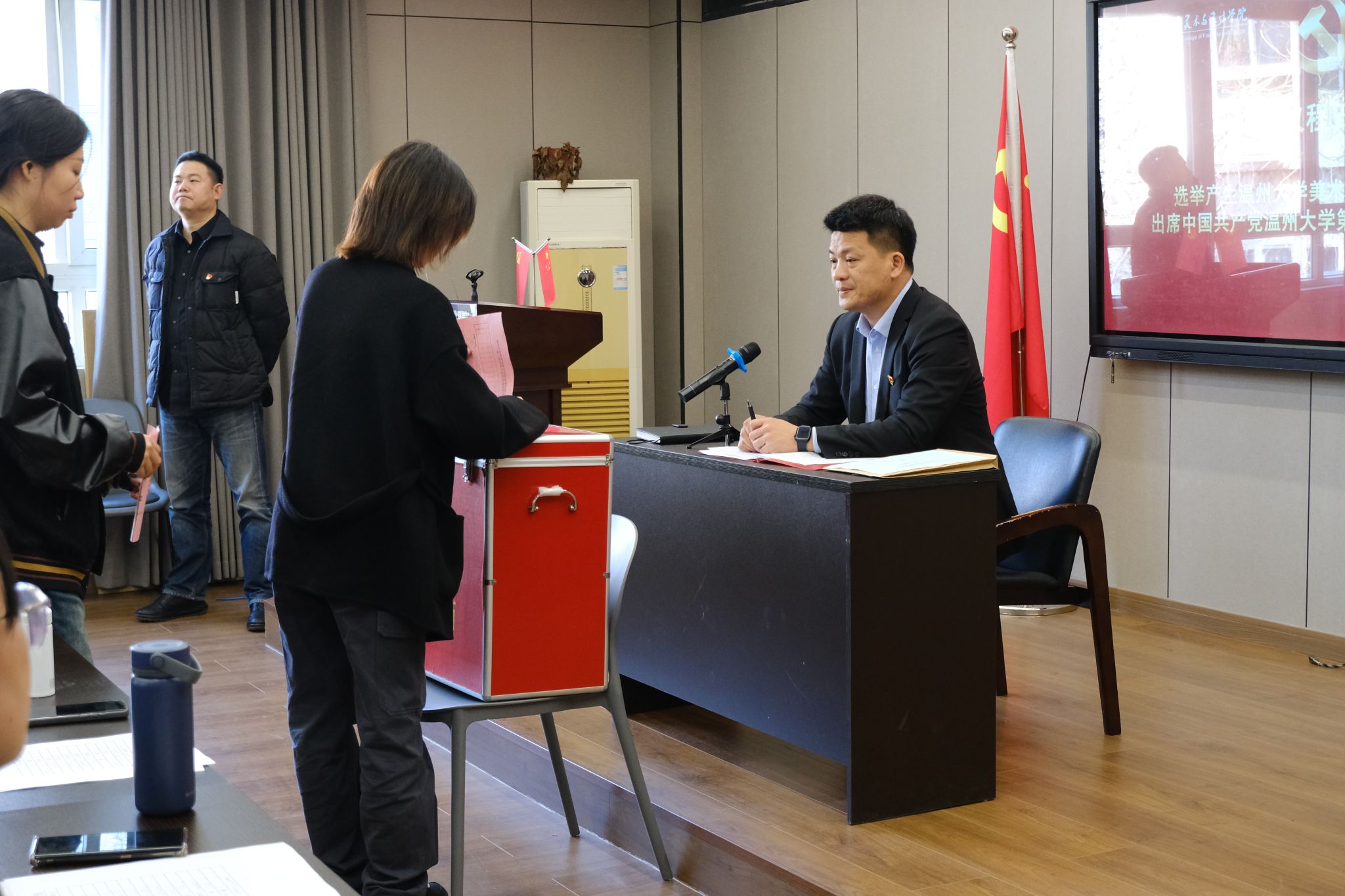 叶正飞书记对beat365网页版登录官网党委出席中国共产党beat365网页版登录官网第三次代表大会候选人预备人选的产生过程进行介绍后,全体正式党员按照座位顺序依次进行了无记名投票,通过差额选举的方式进行民主选举。投票环节结束后,在监票人的监督下,计票人进行计票。最终,会议选举产生beat365网页版登录官网党委出席beat365网页版登录官网第三次党员代表大会的5名正式代表。