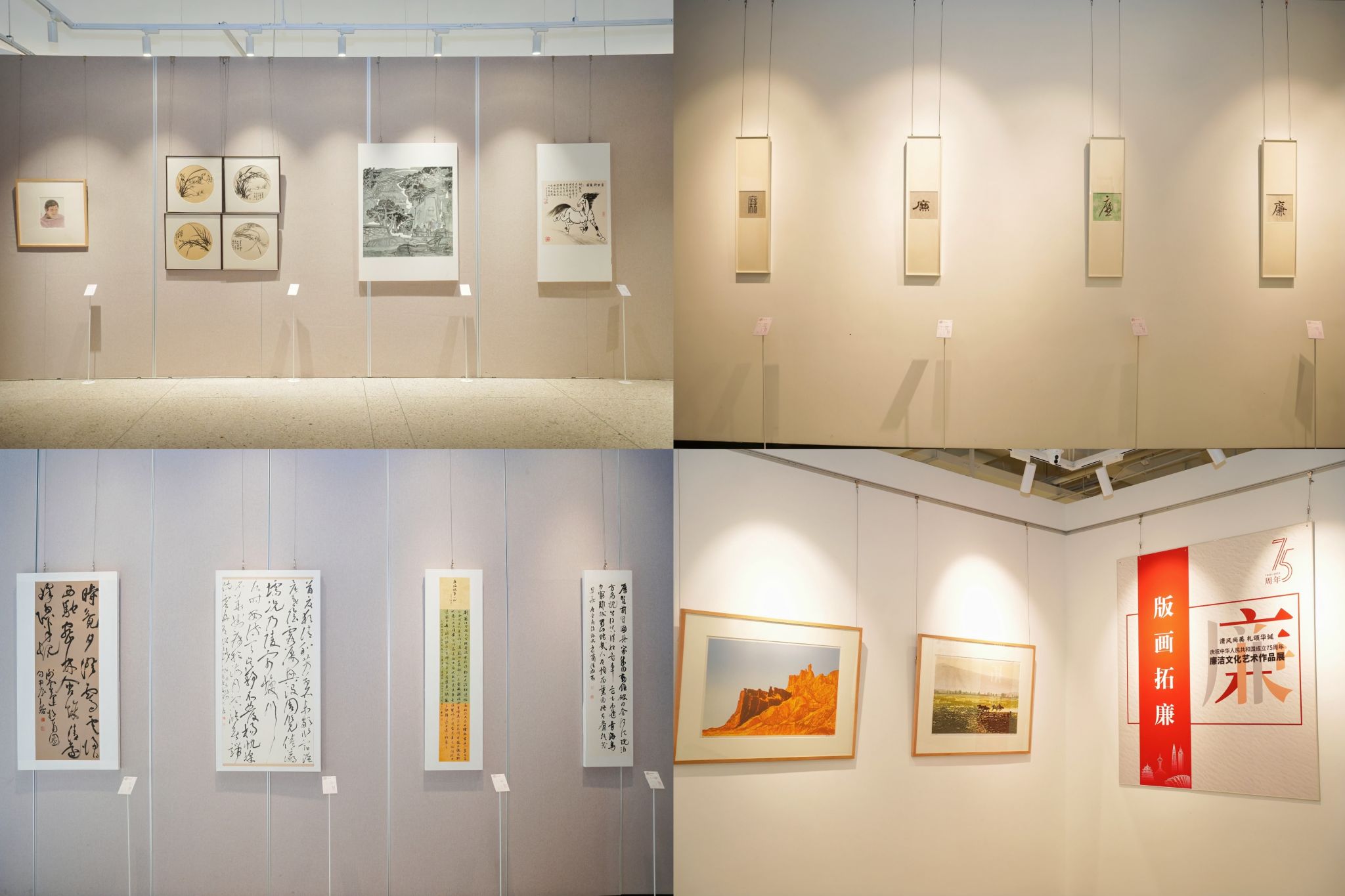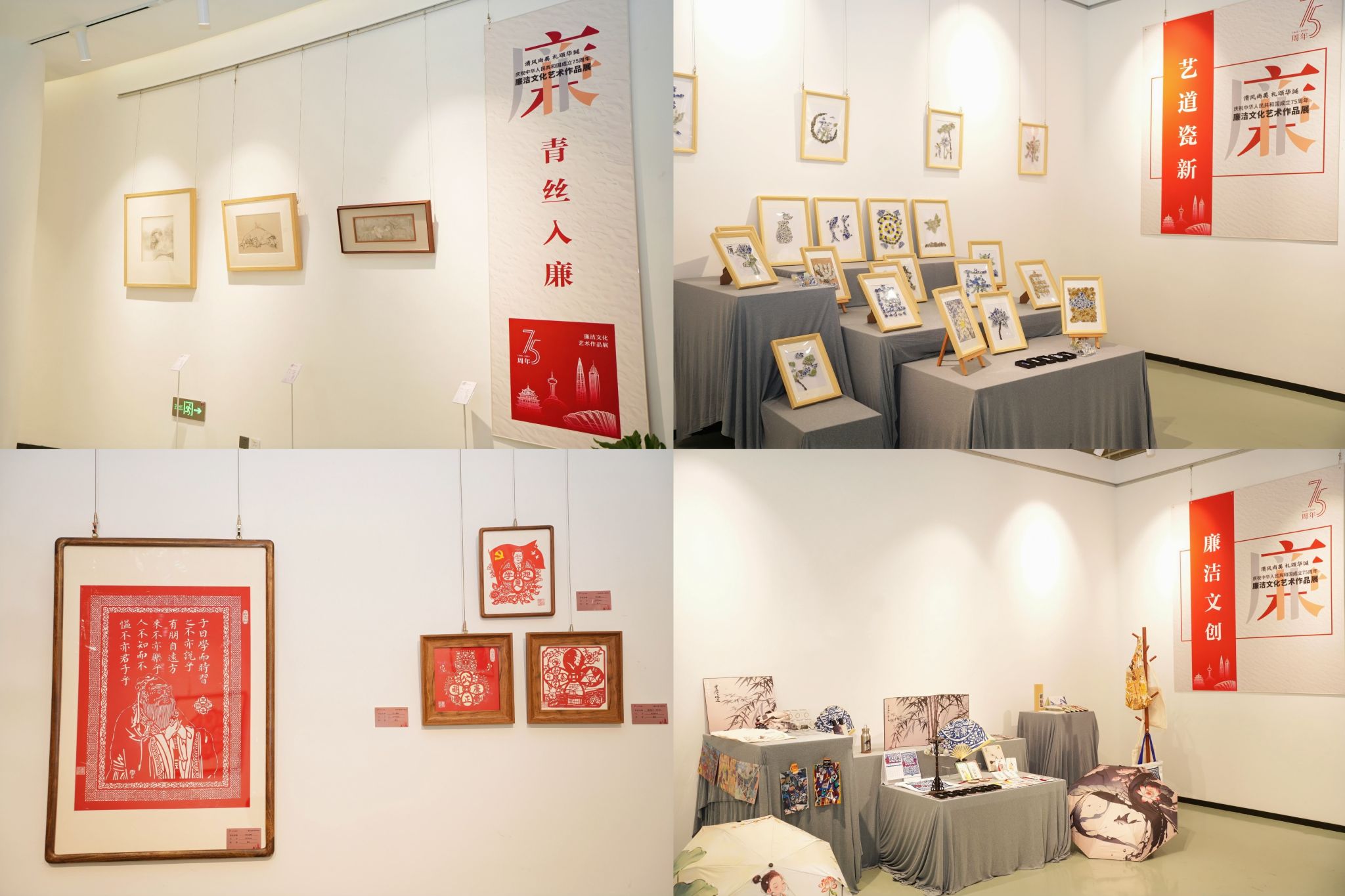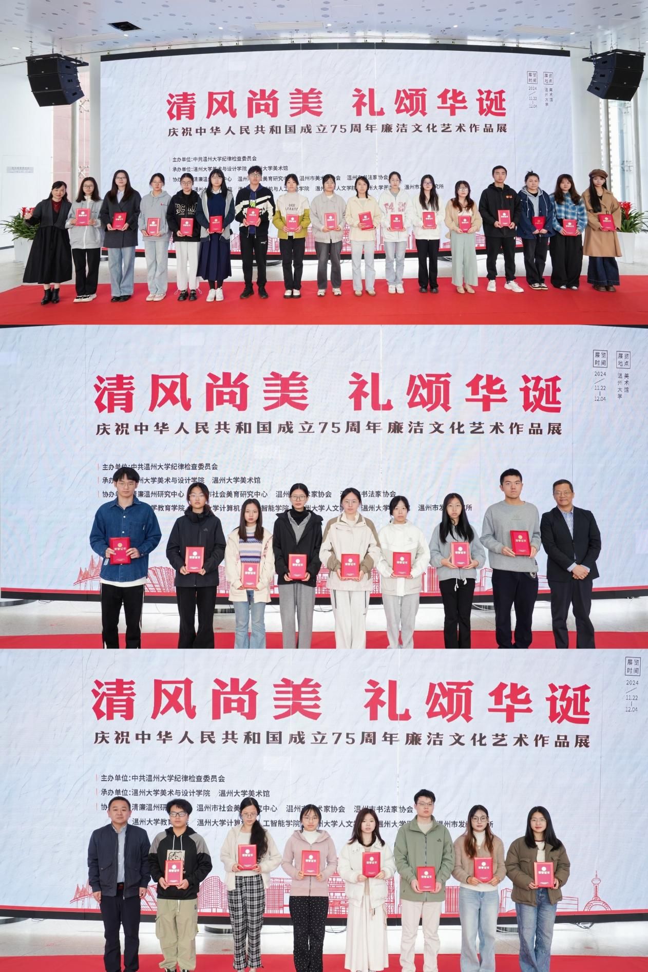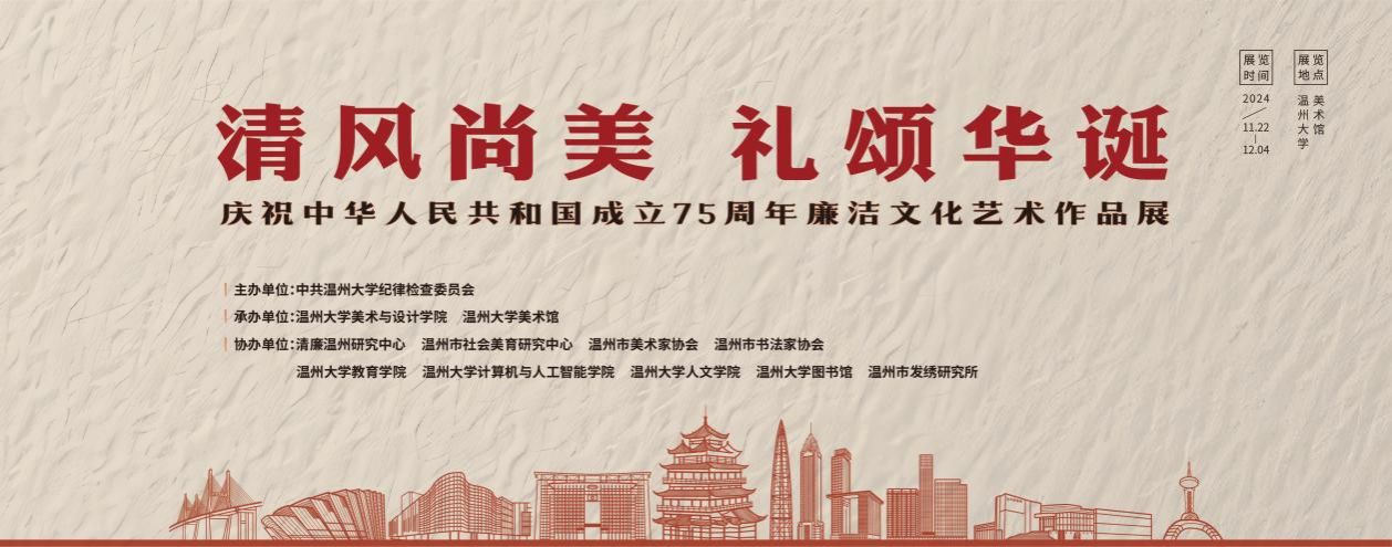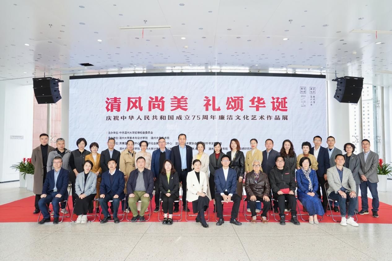 11月22日上午,“清风尚美 礼颂华诞——beat365网页版登录官网庆祝中华人民共和国成立75周年廉洁文化艺术作品展”开幕式在校美术馆举行。温州市纪委、市监委第一监督检查室主任潘徐丹女士,温州医科大学党委委员、纪委书记章红波先生,beat365网页版登录官网党委委员、纪委书记李都金先生,温州理工学院党委委员、纪委书记王华先生,温州市美术家协会名誉主席戴宏海,温州市文联副主席谢子康先生,温州市美术家协会书记、副主席、beat365网页版登录官网院长谢子静女士,温州市书法家协会主席吴聘真先生、副主席楼晓勉女士,温州市美术家协会副主席陈旭海先生,beat365网页版登录官网相关部门负责人、协办单位领导、二级学院纪委书记等出席仪式。