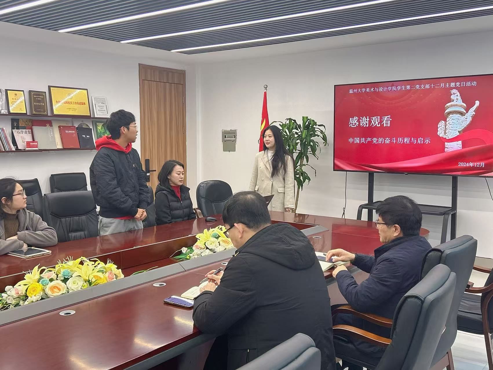 2024年12月31日上午,beat365网页版登录官网学生第二党支部在美术楼2B216会议室开展以“跨越百年,党心永恒”为主题的专题学习会,校党委委员王军作为联系该支部的校领导全程参与指导活动。学院党委书记刘青松、学生第二党支部党员全体参加。活动由支部书记陈嘉怡主持。专题学习会上,支部党员李琳从三个视角讲述了中国共产党百年来的奋斗历程:党始终凝聚人民意志,引领国家走向胜利;党勇于自我牺牲,推动民族伟大复兴;党领导下人民军队屡创辉煌,铸就钢铁长城。通过一系列生动鲜活的案例,李琳同志带领与会党员重温了中国共产党波澜壮阔的历史征程,深刻激发了大家对党史的学习热情。会上,党员同志们积极踊跃地分享个人的学习心得与实践经验,不仅展现了新时代学生党员们昂扬向上的精神风貌,更体现了对党的事业的高度责任感和使命感。党员分享交流副校长王军总结中国共产党是依靠学习走到今天,也要依靠学习走向未来。面对复杂多变的国际环境和日益激烈的就业竞争,王校长指出,学习依然是学生的首要任务,但更重要的是培养综合能力,将理论知识与实践相结合。同时提倡同学们尝试突破本专业的界限,积极涉足多元化学科领域,以拓宽知识视野深化理解与应用,在职业生涯中展现出更加卓越的竞争力与灵活性。最后,副校长王军对学生第二党支部及党员服务中心的同学们提出殷切期望,希望能够充分发挥模范带头作用,不仅在学业上追求卓越,更要在思想觉悟和社会服务方面树立典范,引领全体同学共同进步,为构建和谐校园贡献先锋力量。全体合影