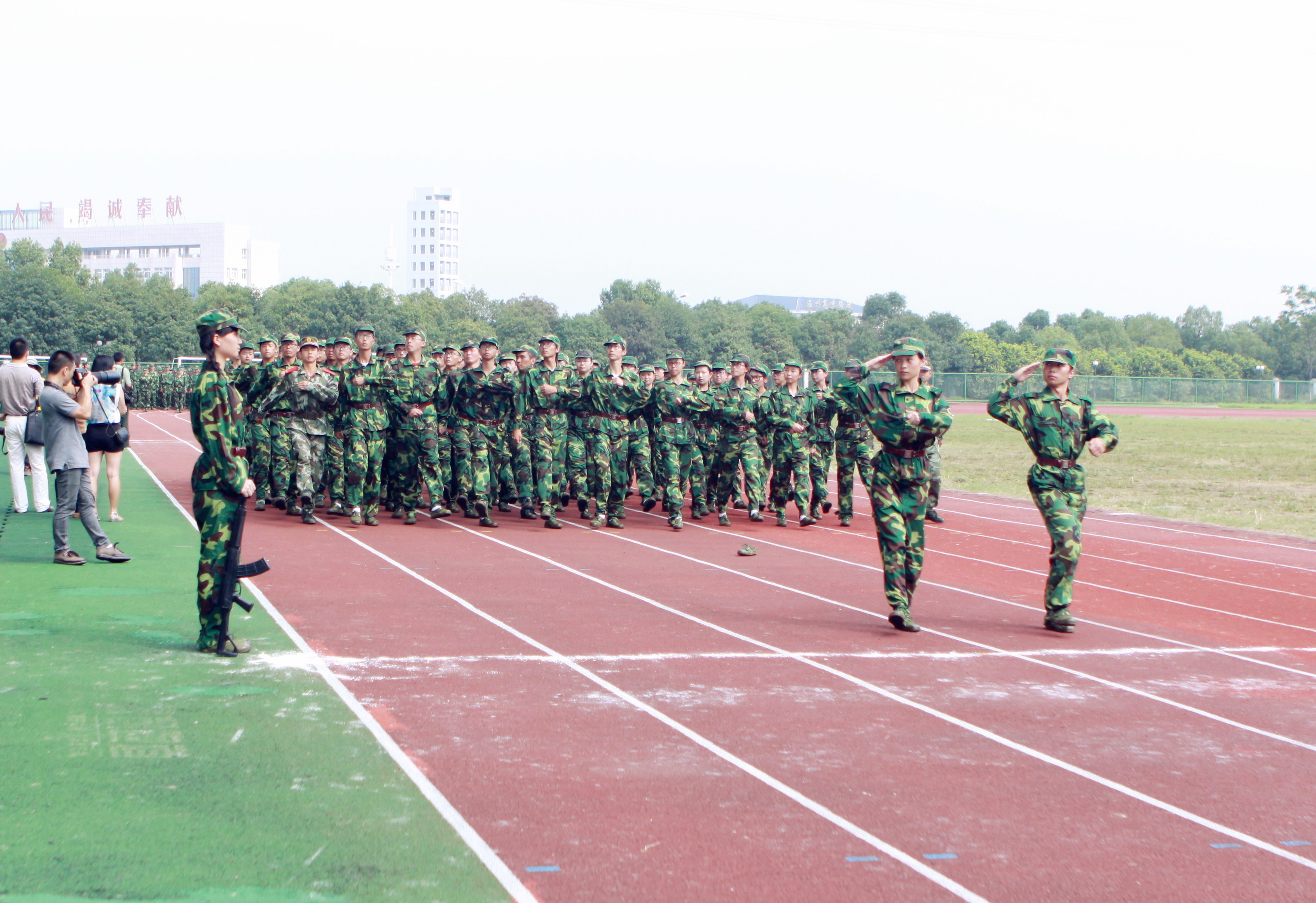 伴随着雄壮的义勇军进行曲,军训成果汇报大会正式开始。经过为期一周军事训练的2014级新生们迎着清晨的朝露,排着整齐划一的队伍,透露着自信的笑容,嘹亮的呐喊声响彻校园上空,折射出青春的光芒。