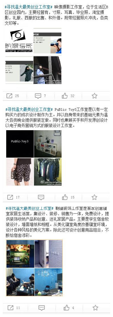 创业实践部人员通过海报、微信、微博等多元化平台,面向全校学生进行了宣传。截至5月20日,共有五家工作室参与评选,分别是:风向文创设计室,它是一家专业设计工作室,主要领域是产品设计,平面设计,设计制作等;映像摄影工作室,它主要经营寸照、写真、毕业照、淘宝摄影,礼服、西服的出售和外借,附带经营照片冲洗,各类文印; PuBlic 7oy3工作室,它是一家以成衣设计制作为主的服装工作室,为学校各类晚会提供服装定做,兼顾买手和以电子商务营销方式的原创设计;朝寝装饰工作室,它是学校首家创意寝室家居生活馆,集设计、装修、销售为一体,免费设计,提供寝室装饰收纳产品和创意、送礼家居产品等; MSSLU工作室,它主要领域是潮态生活,创意设计,活动策划等。比赛通过微博点赞和转发的方式,综合评委意见,最终选出人气奖、专业奖和效益奖。