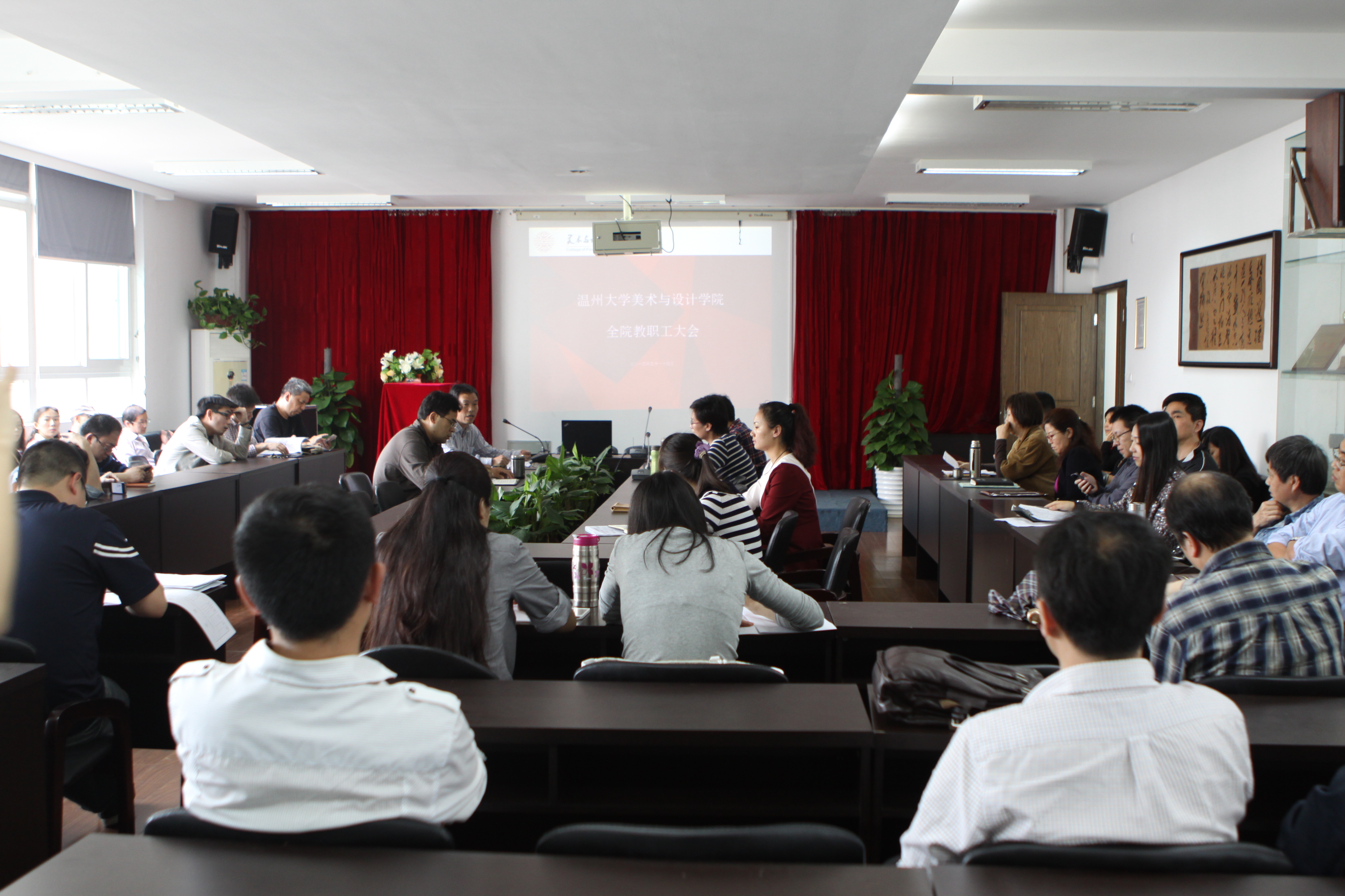 5月14日下午,beat365官网学期中全院教职工大会在2B4001多功能厅举行,院领导李运河、郑彩莲、蔡可群、杨振海及全体教职工出席。院党总支书记郑彩莲主持会议。 会上,蔡可群副院长首先就即将开展的毕业作品展、服装动态秀做了具体工作安排;对各专业人才培养方案修订做了说明,强调要加强对实验室的安全管理工作。杨振海副书记就往届毕业生就业调查、2014届毕业生就业工作及“大艺展”作品收集等工作做了说明与强调。 李运河院长对全院前阶段工作做了总结讲话。李院长首先对学校领导的人事及分工变动做了通报,随后就学院的教学、科研、对外交流等工作做了统一部署。他要求:一要时刻关注学校政策变动,保持敏感度;二要“走出去,引过来”,通过学院交流、教师参展、学院办展等多渠道、多方式加强艺术交流,营造美院艺术氛围;三要将教学、科研有机融合、紧密联系,保持追求艺术理想的同时不断提高服务地方能力;四要专业带头人要在不断凝练专业特色的同时带领团队做出更好成绩。 郑彩莲书记作了总结强调。她指出当前要强调“抓制度”、“强能力”、“促发展”,切实做好学院各项工作。毕业生作品展要提高作品质量;毕业生就业工作要脚踏实地认真做好每一环节,以保证本届毕业生的就业率和下一届的招生工作顺利进行。 会后,学院胡文超、王业宏两位老师就自己在台湾大同大学和美国康奈尔大学的访学经历与在场教师做了精彩分享。校图书馆王希老师也为beat365官网教师做了“提高资源利用、助力教学科研”的讲座。