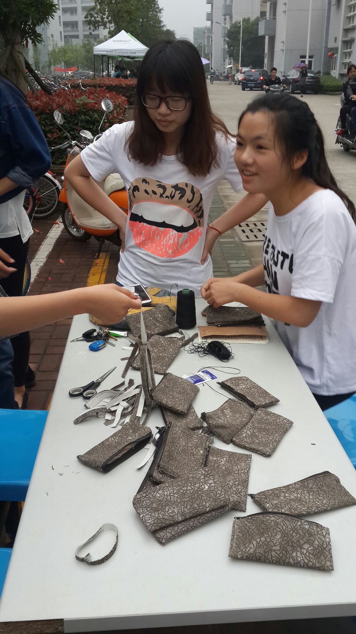 活动当天,“艺家人”青年志愿者协会的干事们早早地来到活动场地进行布置。下午2:00,参与活动的志愿者陆续到场,现场变得热闹起来,活动正式开始。志愿者们按捺着内心的兴奋和激动,穿针走线,一只只精美的钱包一点点地从他们的手中诞生。天公不作美,毛毛细雨飘落下来,但是这一点也没有影响活动的进行和大家的热情。干事们为正在耐心细致地缝制钱包的志愿者们撑起伞,一把把连接的伞为活动的顺利进行撑起了一片晴天,而参与制作钱包的志愿者们更加卖力地进行缝制,不多久,那些包含着爱心的钱包就已经不经意地摆满了张张桌子,琳琅满目,就像一颗颗跳跃的心。