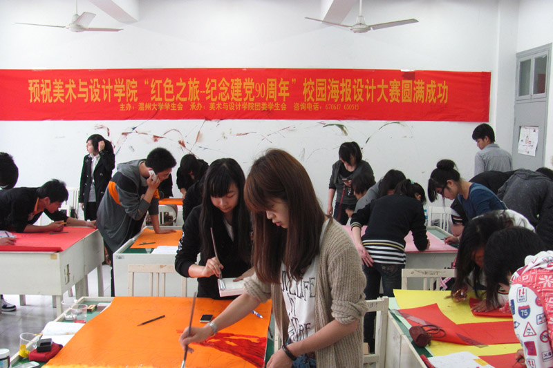 穿越氤氲的风烟,走过蒙尘的岁月,历经血战,改革和创新的风雨洗礼,中国共产党迎来了她90岁的生日。为讴歌建党90年来所取得的伟大成就,beat365网页版登录官网举行了一系列“红色之旅——建党90周年”主题活动。 2011年4月16日下午,由beat365网页版登录官网学生会主办,beat365网页版登录官网团委学生会承办的beat365网页版登录官网首届“艺生艺色”校园艺术系列大赛暨beat365网页版登录官网第十二届“艺苑杯”之“红色之旅——建党90周年”校园海报设计大赛活动在美院火热举行,率先拉开了颂党系列活动的序幕。 此次比赛面向全体温大学生开展,分为专业组和非专业组。以整体效果,紧扣主题,艺术美感,构思创意,作品介绍这5个方面作为评分标准。专业组分为一二三等奖,非专业组分为一二等奖和创意奖。 本次活动大概有25组专业组同学和30组非专业组的同学报名参加。天空下着大雨,每个人进来的时候都湿漉漉的,但丝毫没有影响到他们参赛的热情。同学们一个个专心致志,抓紧时间,一笔一划都耐心仔细的勾勒着,气氛十分浓郁。工作人员们为了及时给每位选手提供所需的用具也都忙碌的奔波着。 博观而约取,厚积而薄发。同学们虽没有“笔落惊风雨”之势,却也各个通过自己的精心设计,为大家展现了一场美仑美奂,精彩纷呈的书画创意设计秀。 本次活动以红色,建党为主题,主要是为了增强同学们对党的认识和了解,回顾并学习党的历史和传统,培养时刻跟着党走的意识。 90年风雨沧桑,90年岁月峥嵘,90年白驹过隙。中国共产党始终屹立在时代的顶端,历久弥新。借这次党90岁生日的机会,希望同学们可以踊跃参加一系列的红色建党活动,在这些形形色色的活动中体会到党的真谛。 文字:顾超群 摄影:顾超群