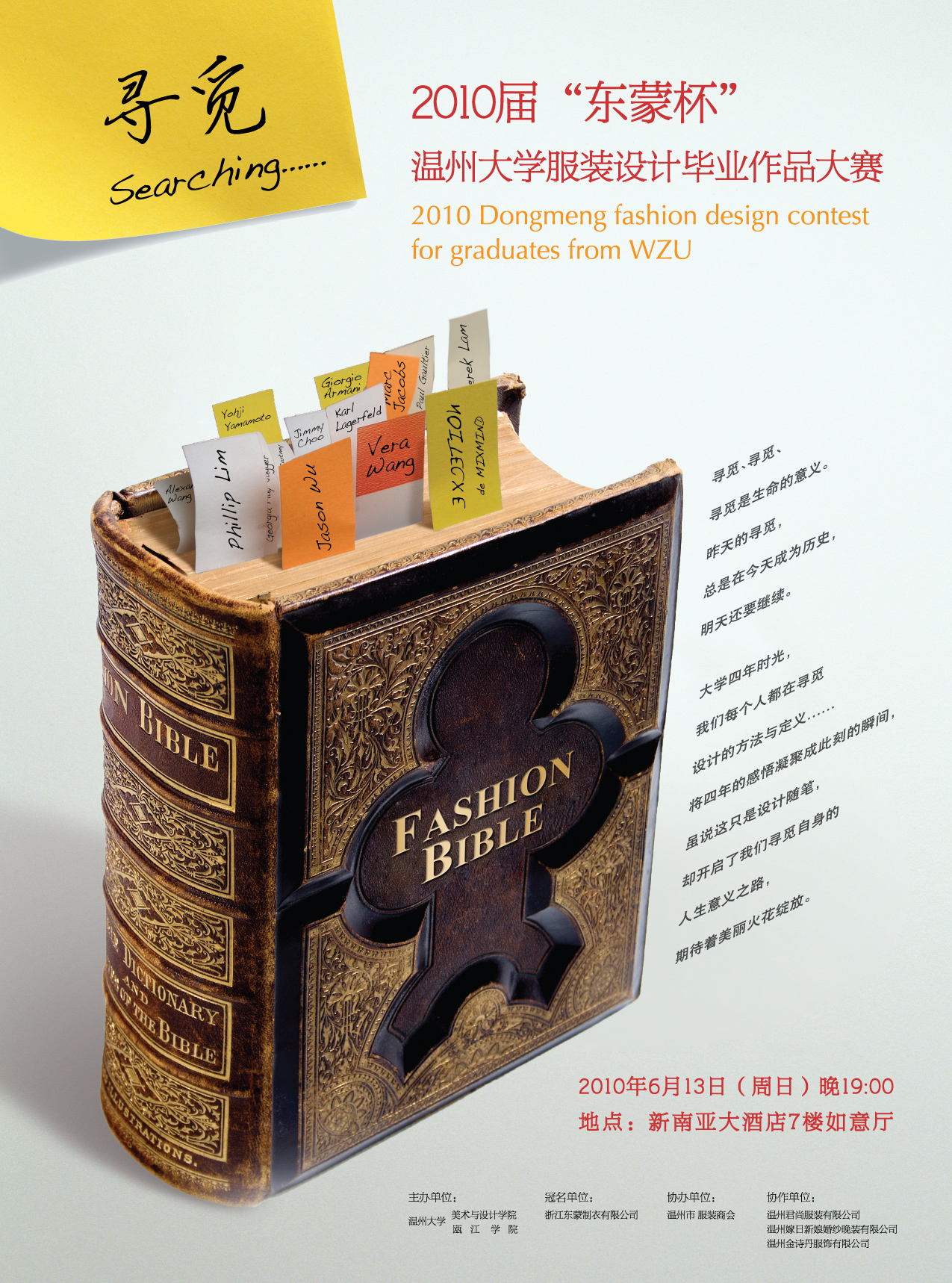 流行缤纷,霓虹异彩。一年一度的服装设计专业毕业设计作品动态展即将揭开她神秘的面纱。多年来,我们欣赏了她的优雅高贵、纯洁浪漫,见识了她的秀丽妩媚、热情奔放。今年,她将带着更为绚丽成熟的魅力,更富创意设计的姿态,奉献给我们一场时尚的饕餮大餐。在她身上,我们可以领略风格鲜明、个性独特的服装魅力,感受时尚精美、收放得体的整体造型,了解2011年服饰的时尚前沿与流行趋势…… 本次大赛主题为“寻觅searching”,服装展示分四大板块:品牌T台秀、时尚职业装、时尚礼服和创意概念装。模特主要来自beat365网页版登录官网服装表演班的优秀学生及专业星娱公司名模。 历年来,beat365网页版登录官网服装系与温州多家知名服装企业合作,以服装设计大赛的形式共同完成毕业设计,秉承“以赛促学,以展促学,以校企合作促就业” 的教学理念,搭建校企互动平台,为地方服装产业培养了大批服装类专业人才。 展示时间:2010年6月13日(周日)晚19:00 展示地点:新南亚大酒店7楼如意厅 主办单位:beat365网页版登录官网 瓯江学院 冠名单位:浙江东蒙制衣有限公司 协办单位:温州市服装商会 本次动态展有部分席位向全校师生开放,需凭票入场,数额有限,领完为止。 领票时间:2010年6月9日(周三)8:00—16:00 领票地点:beat365网页版登录官网南校区2B-214办公室 联系电话:86689181 联系人:曹老师 beat365网页版登录官网 瓯江学院