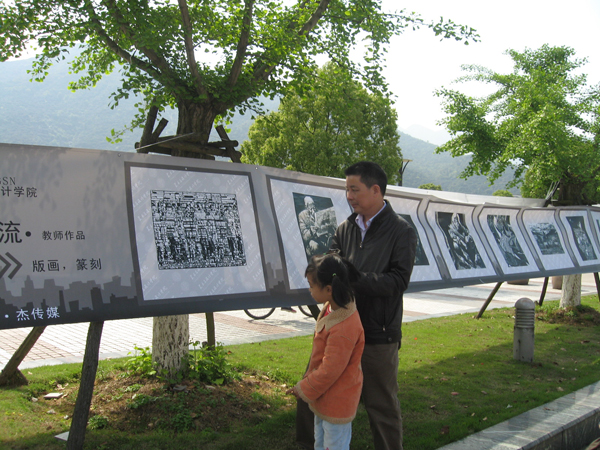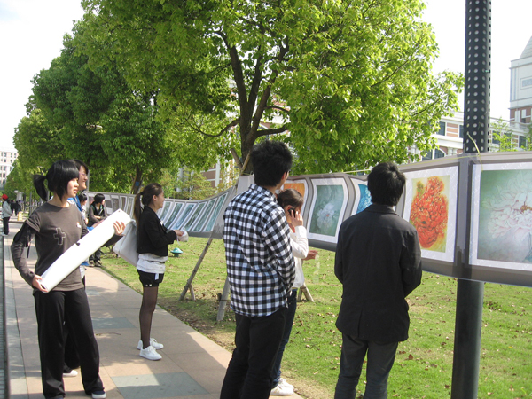 经过多个月的准备,备受期待的第十一届“艺苑杯”广度篇之“艺术漂流”活动于2010年4月25日终于赢来了她的开幕,在温州医学院同德广场举办其第一站展示,并作为国萃的一部分融入中国馆,共同参与温州医学院主办的“迷你世博会”。 当日春风和煦,暖日融融,可谓天公作美,为艺术漂流打响了第一炮。百余幅师生作品——国画、书法及版画创作等隆重登场悬挂于道路两侧,在阵阵微风中迎风招展。更有七幅真迹惊艳全场,是为压轴大戏。引得路人纷纷驻足欣赏,仔细品味。更有数个专业班同学于中国馆中现场表演,应游人要求作画题字。所创作品皆响应“迷你世博会”号召,用于义卖,为玉树灾区贡献微薄的一份力量,尽一份当代大学生应尽的义务。 此次艺术漂流不仅展示我美院多年以来的教学成果,向社会提交一份令人欣慰的答卷;更是熏陶医学院的众多师生,增长其艺术涵养,开阔其艺术眼界;同时还向众多的外国友人展示中国美学,弘扬国粹,在美学上进行国际交流。 艺术漂流第一站之温医站目前已获圆满成功,在此预祝接下来的几站展示亦能获得佳绩。