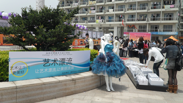 2010年4月28日对同学们来说是再普通不过的日子,与往常一样的早起赶上课、下课冲食堂。然而今天,许多同学却停下了匆匆的脚步,被一些创意独特的鞋靴、服饰等吸引,纷纷驻足在温大生活区A区,欣赏由温大beat365网页版登录官网主办的“艺术漂流”巡回展览。