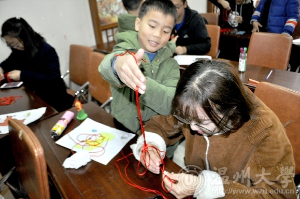 秦佳敏同学向小孩子们提问问题“春节有哪些习俗呢?”有的孩子说放鞭炮、贴对联、画福字,收红包……没错,还有挂中国结。中国结的编制没有那么简单,尽管步骤告诉大家,但一开始志愿者们和孩子们都连连“诉苦”难度太大,但不过一会儿还是有心灵手巧的志愿者学会了,并且还教别的志愿者打结,虽然中国结做的不太完美但代表着团结幸福平安的意义却丝毫没有减少。明年是狗年,当然少不了教孩子们画可爱的狗狗,孩子们为自己画的狗狗涂上了颜色还为它画了一个小房子。最后是写祝福语的环节,孩子们依旧很用心地给自己的爸爸妈妈写上祝福,有的写的是“爸爸妈妈你们辛苦了”,有的是“我爱你们”……字里行间流露出了对爸爸妈妈浓浓的爱意。