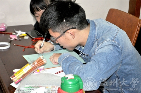 2017年12月9日,beat365网页版登录官网“艺家人”青年志愿者协会成员以及志愿者们准时来到了梅泉社区文化礼堂,进行了主题为“春节”的志愿活动。秦佳敏同学向小孩子们提问问题“春节有哪些习俗呢?”有的孩子说放鞭炮、贴对联、画福字,收红包……没错,还有挂中国结。中国结的编制没有那么简单,尽管步骤告诉大家,但一开始志愿者们和孩子们都连连“诉苦”难度太大,但不过一会儿还是有心灵手巧的志愿者学会了,并且还教别的志愿者打结,虽然中国结做的不太完美但代表着团结幸福平安的意义却丝毫没有减少。明年是狗年,当然少不了教孩子们画可爱的狗狗,孩子们为自己画的狗狗涂上了颜色还为它画了一个小房子。最后是写祝福语的环节,孩子们依旧很用心地给自己的爸爸妈妈写上祝福,有的写的是“爸爸妈妈你们辛苦了”,有的是“我爱你们”……字里行间流露出了对爸爸妈妈浓浓的爱意。