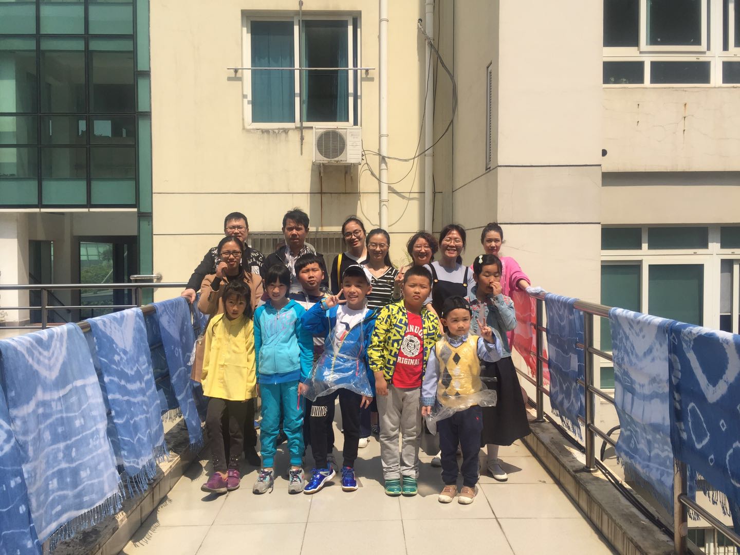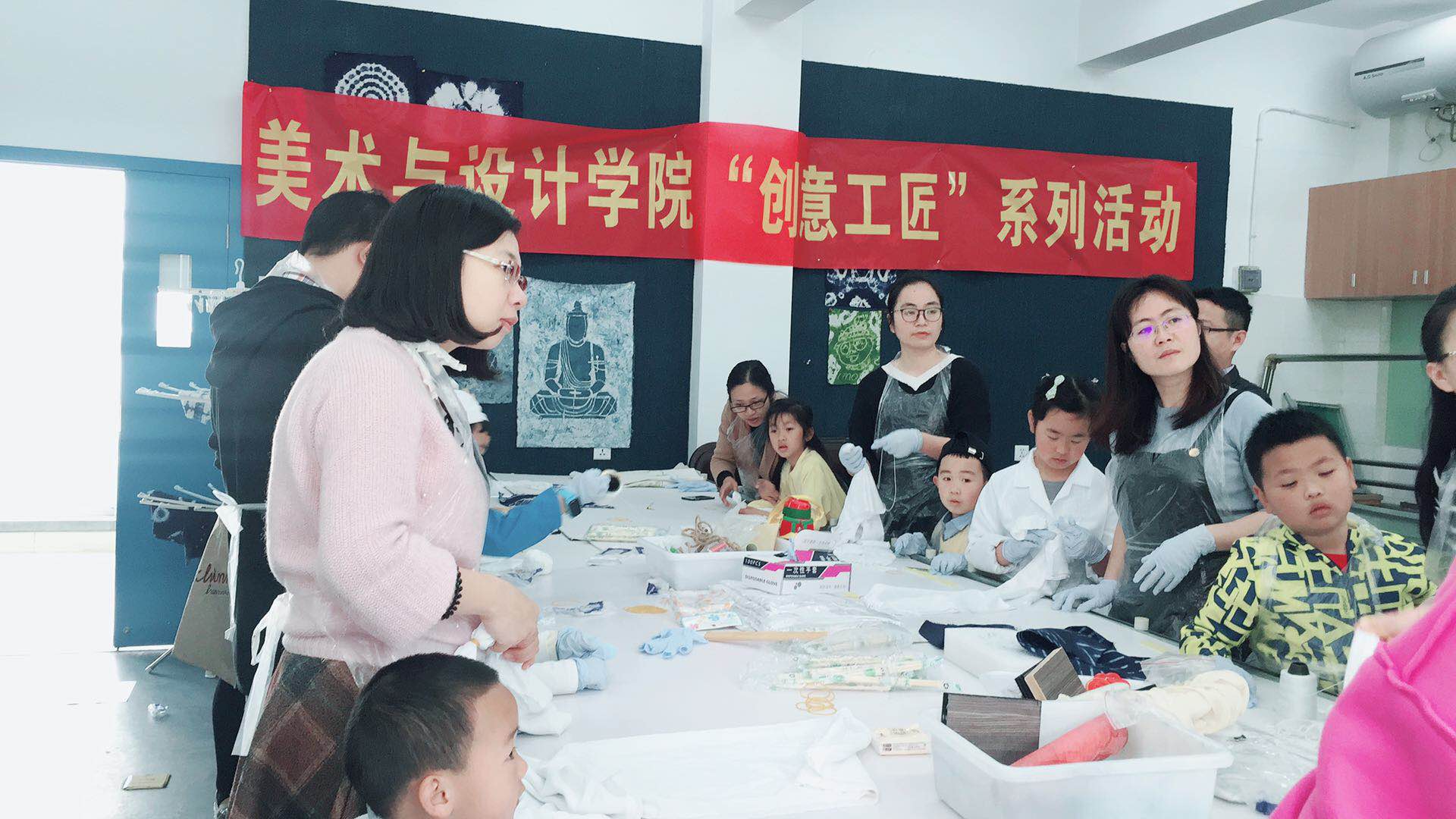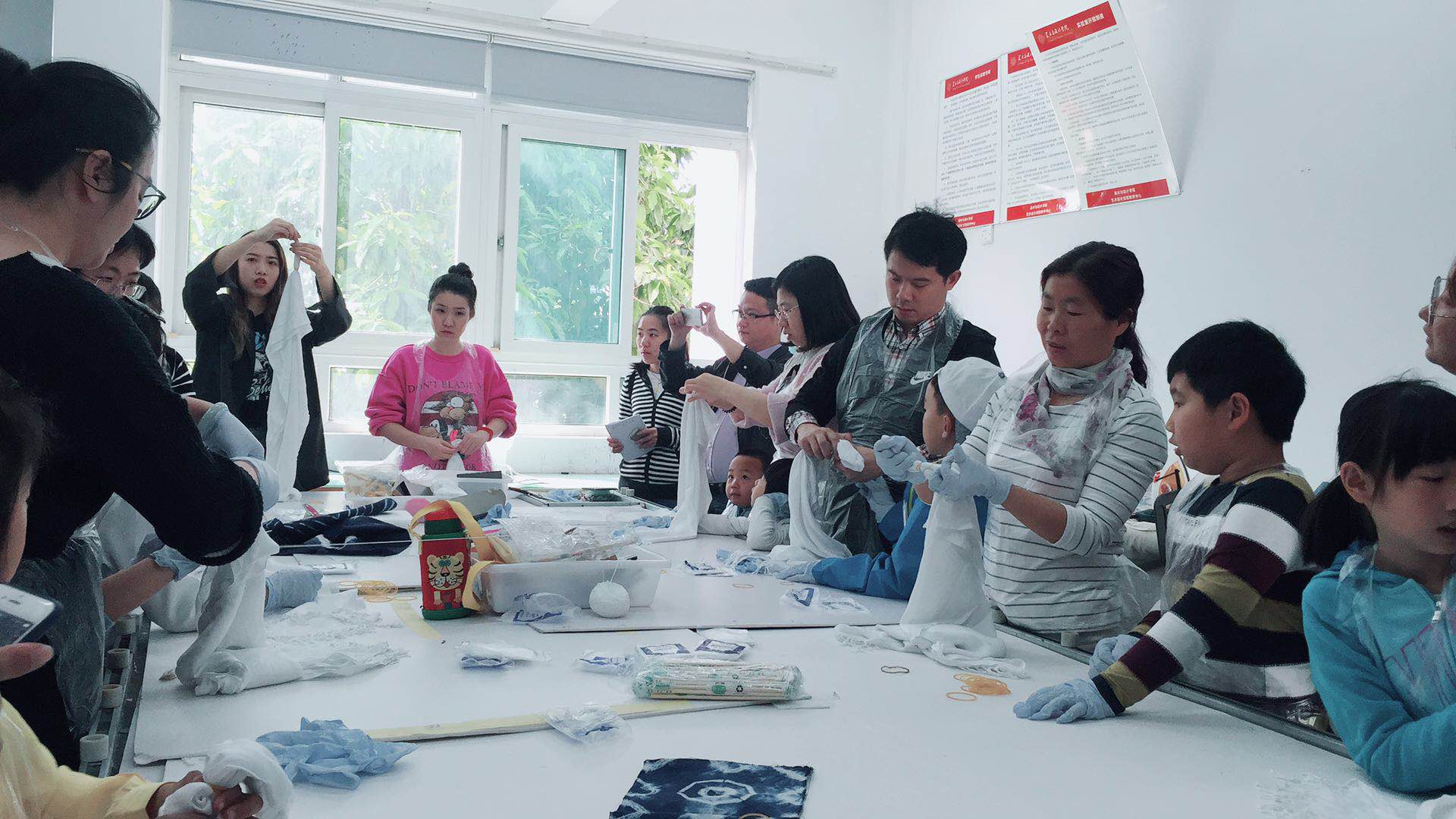 上午九点半,家长带着小朋友们陆续来到了美院服装楼。活动开始,大家在扎染老师的带领下进入了扎染实验室。在正式制作之前,同学们给大家分配了手套、围裙以及白色围巾,还详细讲解了扎染工艺流程。 正式开始制作,经过同学们的扎结教学,家长和小朋友们使用了多种扎布方法完成了围巾的扎结。之后,大家将清水浸泡过的围巾放入各色的染色桶中。通过染色、固色的间隙,大约半小时后,围巾的固色已经完成了,家长和小朋友们回到教室捞出、洗净、晾干各自的围巾,由于扎布方法的不同,大家的作品呈现出了各种样式不一的图案和绚丽效果。