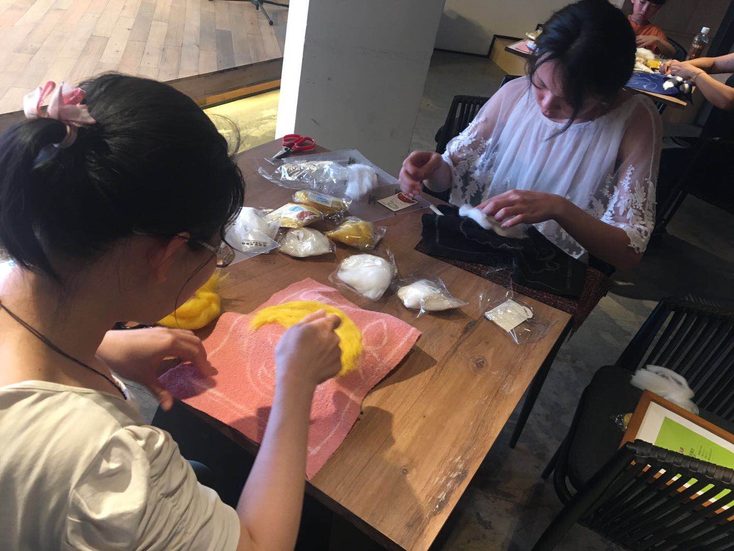 本期面料再造活动由读者现场体验,亲自制作羊毛毡面料作品。通过讲座所述的加法、减法、变形等加工手段,对面料半成品进行二次设计改造,制作最终产品。使读者加深了对面料再造的理解,激发其创造灵感和激情,让我们体会到日常物件变废为宝的乐趣,有助于发掘我们的美学价值及动手能力。、