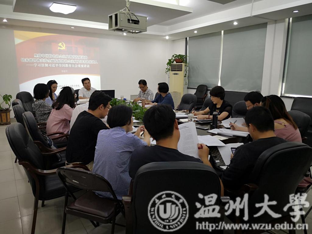 9月26日下午,beat365网页版登录官网在2B216召开党总支中心组理论学习(扩大)会暨党务工作例会,传达学习习近平总书记2018年9月10日在全国教育大会上的讲话精神和省委教育工委副书记陈根芳同志在高校高知识群体中发展党员工作座谈会上的讲话精神。学院党政班子成员、总支委员、支部书记、系主任、各科、教研室主任以及研究生支部副书记参加学习。会议由学院党总支副书记杨振海主持。