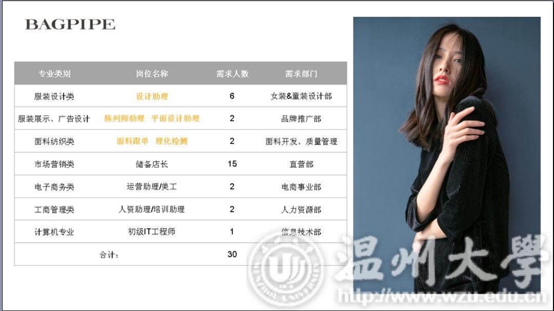 10日19日上午,Bagpipe风笛2019无限想象全国高校巡回宣讲会在美院顺利展开。在多年的合作与交流当中,风笛与温大也结下了不解的情缘。本次宣讲会有学院党总支副书记杨振海与风笛服饰有限公司经理吴朝晓莅临宣讲会现场。 首先是杨书记致开场词,在同学们热烈的掌声中,杨书记侃侃而谈。“温州风笛服饰有限公司与温大美院搭建了一个非常典型的校企合作平台,风笛公司作为我校省级校外实践教育中心,与beat365官网在专业教学、实习实训、就业创业等领域开展全面战略合作,我们非常高兴看到风笛公司一直以来欣欣向荣的发展态势,也希望双方能携手结出更多合作成果。” “不忘初心,使命必达。”风笛宣讲人缪老师在分享风笛创始人创业史、发展史,讲述风笛的过去、现在与未来,同学们都听的津津有味。宣讲会在主持人和同学们的互动中开始后,主持人分别从公司品牌设计风格,员工的衣食住行娱,薪资问题和管培生培养计划等几个同学们关心的方面来介绍风笛服饰有限公司的细节。BAGPIPE风笛成立于1999年,是一家自主开发、生产、销售时尚女装和童装的品牌经营企业。风笛公司的女装品牌分为周末时尚,摩登帅气,精致优雅三个风格,而风笛公司的童装品牌的定位则是针对2-8周岁的儿童设计的,风格多样是风笛公司的优势所在。衣食住行方面,风笛公司也非常重视员工的感受,为他们提供了舒适的环境以便于员工们更好的工作和生活。同时,风笛公司也十分重视对人才的培养,也有一套完整的体系进行人才的引入。这便是风笛管培生培养计划的由来。对于进入风笛上班的应届生,风笛建立了完善的“管培生培养计划”,全面打造“一专多能”的复合型人才,让每个进入风笛的应届生迅速成长,成为独当一面的技术或管理人才。在经过由系统培训、店铺见习、核心轮岗和专岗实践四个环节的管培生培养计划之后,实习生便能更好地融入公司这个大集体。说到薪资方面的话题,风笛公司的PPT上有着这样一段话:“一个人,只有自己成长了,事业才会跟着成长。一个人,只有自身价值提升了,薪资岗位才能跟着提升。”从这段话中我们也可以清晰地看到风笛公司对人才和员工能力的重视。对于服装设计、服装展示、广告设计、面料纺织类的专业,风笛公司也提供了如设计助理、陈列师助理、平面设计助理、面料跟单、理化检测的专业让同学们选择,以便给予同学们更大的就业空间。 “风笛未来,无限可期。”这是这场宣讲会的结束语。无限可期的不仅是风笛的未来,也同样是我们美院同学们明媚的未来。正如主持人所说,人生不设限,未来就会精彩无限。我们也相信同学们在一番拼搏之后,会绽放出人生绚丽的芳华。