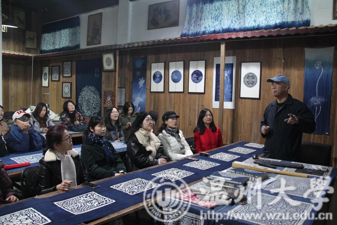 温州蓝夹缬技艺代表性传承人、采成蓝夹缬博物馆的王河生馆长热情地到门口迎接大家。在讲堂落座后,王馆长向老师们介绍了我国夹缬印染的历史发展、原料炼制、工艺流程等知识。大家了解到:夹缬印染工艺在我国有着非常悠久的历史,早在隋唐时期彩色夹缬就已十分兴盛;宋以后由于政治经济的因素,彩色夹缬衰落而蓝夹缬一枝独秀获得了长足发展,至明清已成为相当规模的产业;民国以后由于西方工业化印染技术的传入使用天然染料的传统手工印染业陷入困境,以致前些年蓝夹缬技艺在浙南趋于消亡。在党和政府的关怀下蓝夹缬技艺被列入“国家级非物质文化遗产”得到了保护和发展。“青出于蓝而胜于蓝”的传统蓝夹缬印染技艺焕发出了新的生机。
