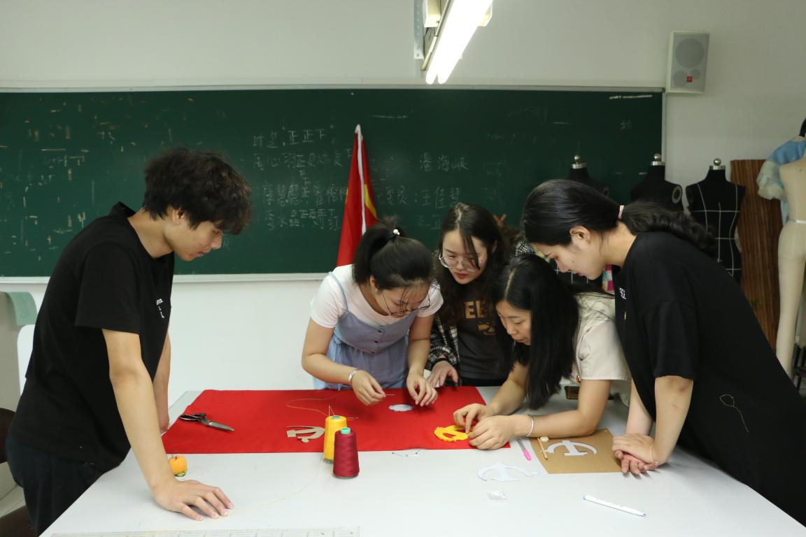 烫布,画样,剪裁,叩烫,暗撬,包边,一环扣着一环。在鲜红色、正黄色的映衬下,师生脸上都不由地浮出一种敬重感,这是对国家、对党的敬意之情,彰显了美院师生对党的热爱。一针一线、千丝万缕的情意都在这鲜红与明黄里,缝出了骄傲,缝进了每一个美院人对祖国发展的美好愿景。