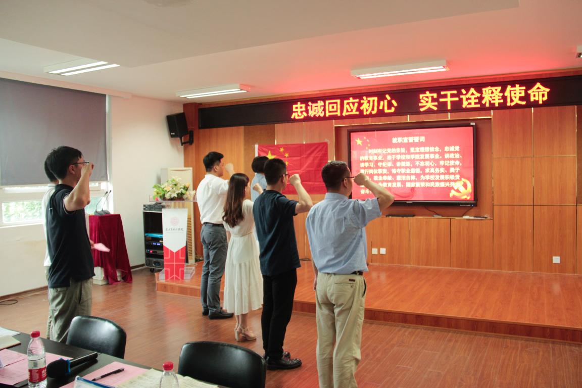 2019年7月7日下午15:30,beat365网页版登录官网党委为更好的贯彻落实学校党委关于“不忘初心跟党走,牢记使命勇担当“为主题深入开展“红七月·服务月”活动。学院党委深入开展“五带头”活动,带头寻初心,在学院2B4001举行了“忠诚回应初心 实干诠释使命”beat365网页版登录官网领导班子及科级干部重温入党誓词暨任职宣誓仪式。