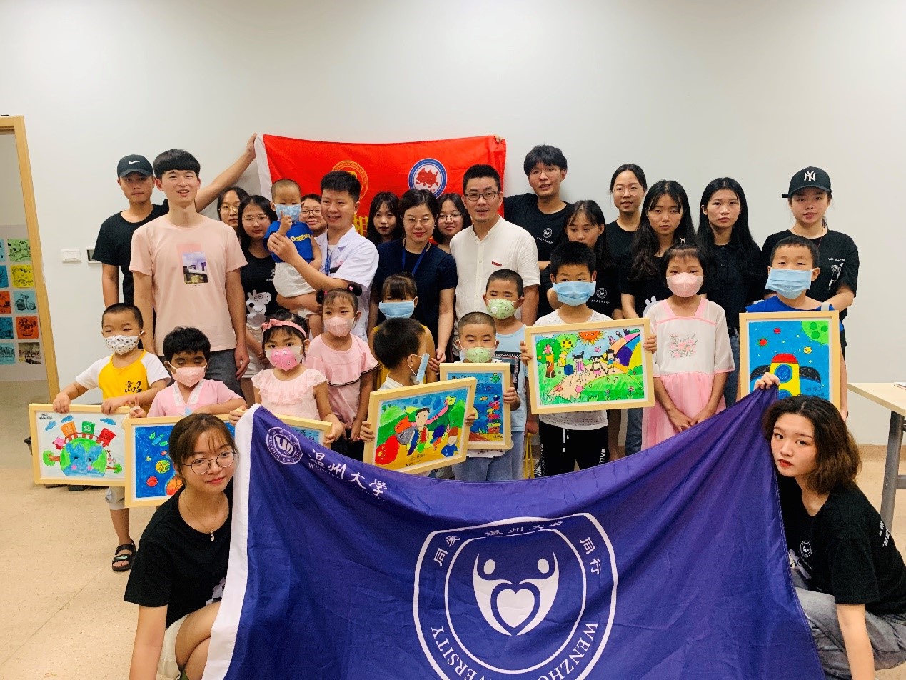 同爱同行”暑期社会实践队是一支由美院、外国语学院、教师教育学院、数电学院、建工学院和生环学院等学院学生组成的暑期实践队,共有22名队员,由许丽慧老师指导。该队伍致力于关爱特殊人群(尤其是生理与心理存在障碍的儿童)开展暑期托管、主题墙绘、问卷调查、社会现象调研、文献资料学习交流和宣传影音资料拍摄推广等实践推广。