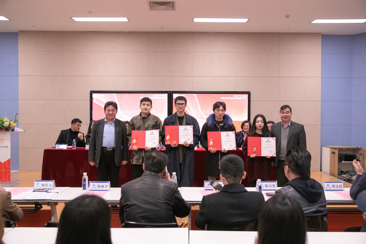 获奖学生代表李树朋发言,他向中国皮革协会表示了衷心的感谢,并表达了要在学习路上不畏困难,坚持梦想,用自己的能力回报母校,贡献行业,将温大文化不断传承与发扬。
