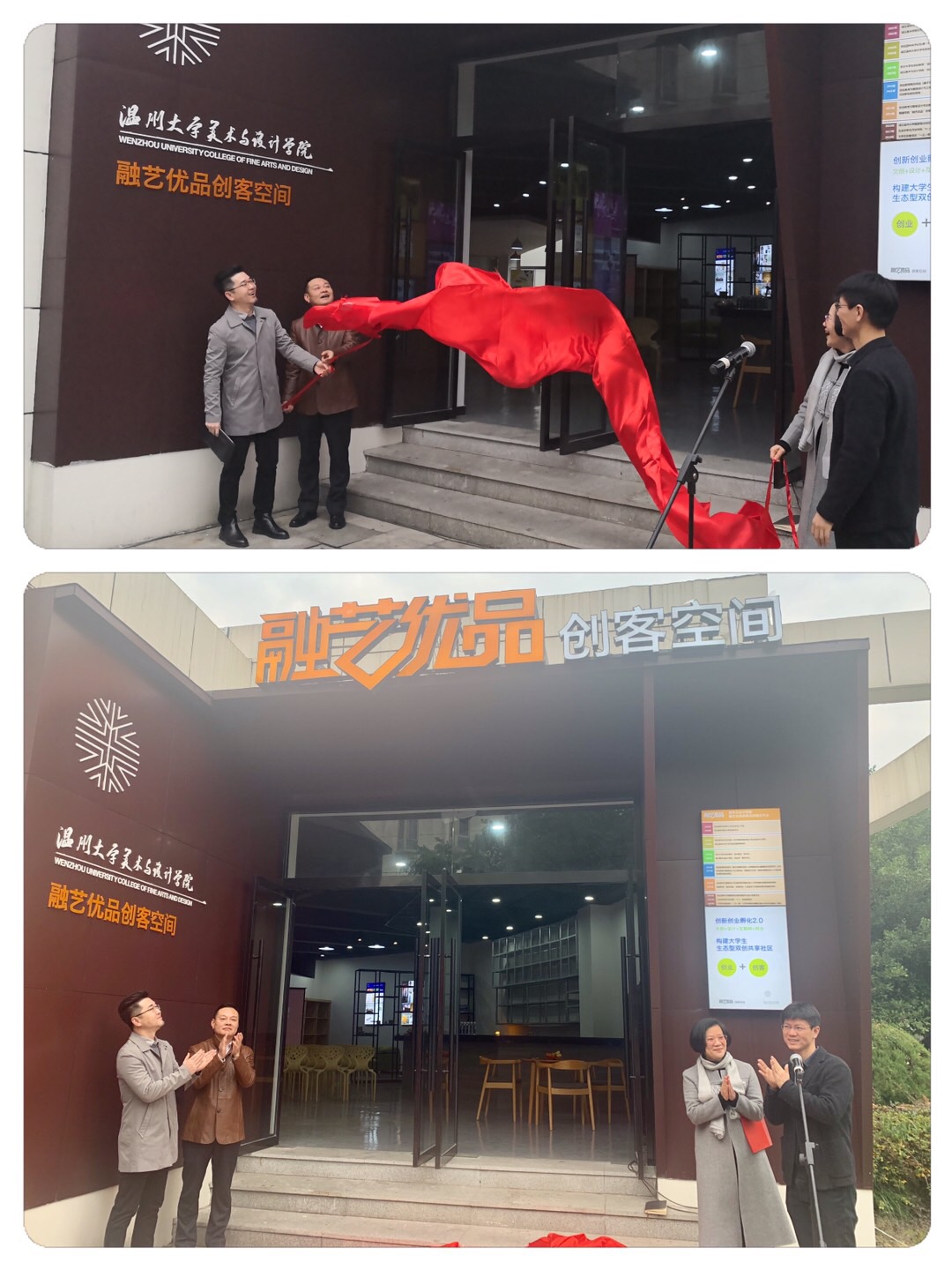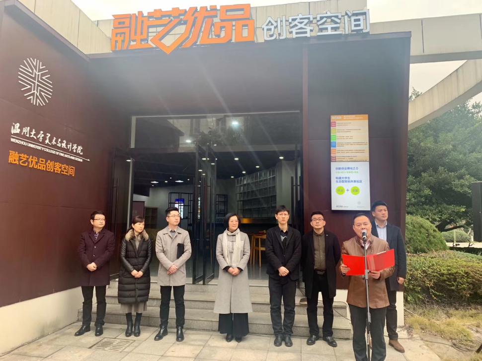 2020年1月3日上午,beat365网页版登录官网“融艺优品”创客空间揭牌仪式隆重举行。beat365网页版登录官网党委委员、宣传部部长潘玉驹、创新创业学院院长施永川,温州四目公司总经理张登峰、beat365网页版登录官网院长谢子静、党委书记叶正飞等院领导班子及入驻团队师生出席了揭牌仪式。