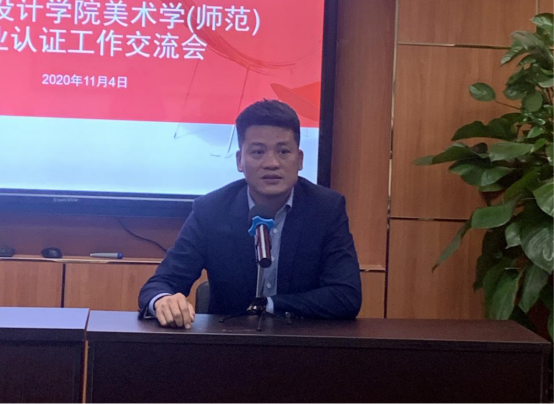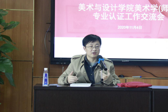 2020年11月4日,苏州大学艺术学院美术系主任陈铮教授应邀来beat365官网指导美术学师范专业认证工作,院长谢子静、学院党委书记叶正飞、副院长胡文超出席会议,美术系全体教师及相关教师参加会议。 首先,谢子静院长代表学院对陈铮教授的到来表示热烈欢迎,同时,围绕着美术学学科建设、专业建设以及人才培养质量等学院发展的基本情况作了重点介绍。她表示,beat365官网与苏州大学艺术学院的办学情况有着很大的共通性,双方的沟通交流更有着长期且深厚的基础。苏州大学艺术学院美术学专业顺利通过师范专业认证,对beat365官网美术学专业师范认证是一大鼓舞。苏州大学的成功经验,也必将为beat365官网师范专业认证起到良好的学习和借鉴作用。 随后,陈铮教授结合苏州大学美术学师范专业认证工作的实践经历进行了经验分享。他从教师身份和专业使命出发,明确师范专业认证的意义和重要性。以认证准备工作为着手点,提出厘清各级组织的工作任务和职责是认证工作顺利开展和持续推进的前提。深刻剖析OBE理念,明确人才培养方案设计的重大作用,提出坚持以学生为中心的课程设置和以产出导向的反向设计理念,并明确要以五年为基准形成改革闭环的中长期计划,持续推进师范专业认证工作。 最后,叶正飞书记作总结讲话。他表示,陈铮教授对专业认证工作的深入分析和倾囊相授的宝贵经验,不仅让beat365官网教师在政策领会和宏观认识上有了更加清晰的思路和目标,更是结合了beat365官网师范认证工作的实际情况进行对标分析、给出指导建议,内容全面丰富、切合实际,全体与会教师受益匪浅。他指出,美术学师范专业认证工作是事关学院发展的大事,每一位教师应统一思想,明确目标,凝心聚力保证认证工作的顺利完成。 会后,陈铮教授与美术系教师围绕着师范认证的具体工作进行了深入沟通和交流。