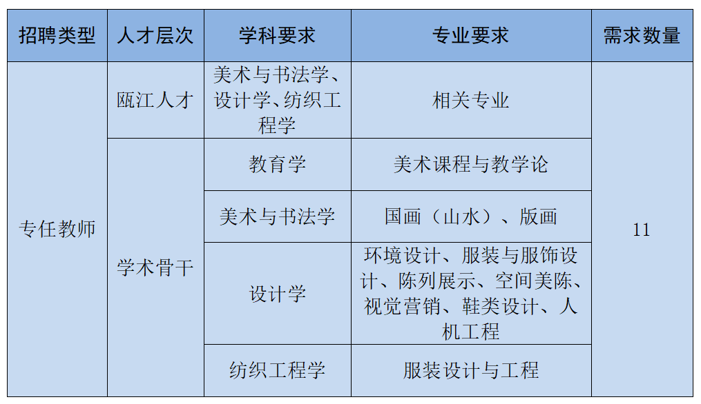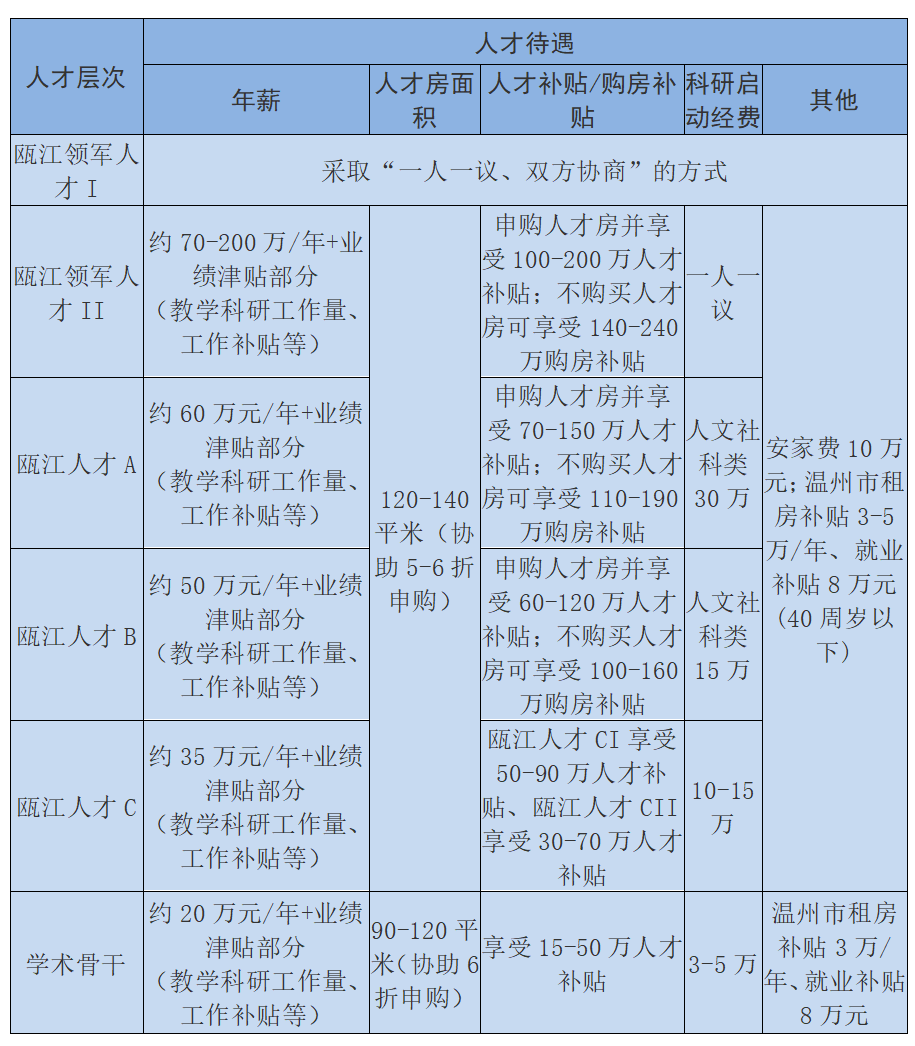 学校高层次人才引进分为五个层次:瓯江领军人才(I-II)、瓯江人才A、瓯江人才B、瓯江人才C(I-II)和学术骨干(I-IV)