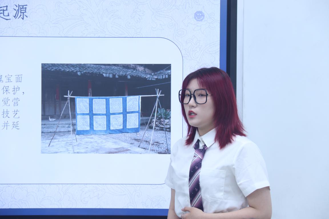 第一位参赛者的演讲是以非遗夹缬为主题的工作室规划,在与评委老师的探讨中,老师问到:“你认为怎么样才能让夹缬更突出,更有竞争力呢?”参赛学生认为,夹缬的色系以蓝白为主,特殊的材料配饰撘配,充分体现了夹缬的独特性,同时非遗也是工作室的一大亮点。这段条理清晰的答辩也大大得到了评委老师的赞赏。