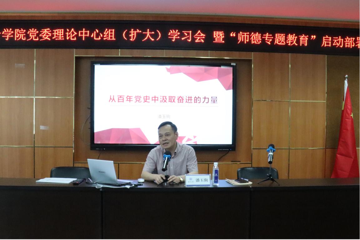 6月16日下午,校党委委员、宣传部部长潘玉驹教授以《从百年党史中汲取奋进的力量》为题为beat365官网师生党员上专题党课。潘委员从中华民族的历史史册开篇,带我们重温半条棉被、抗日英雄杨靖宇等党史故事,回顾中国共产党传奇的建党历程,指出我们党的光辉百年,是矢志践行初心使命的一百年、是筚路蓝缕奠基立业的一百年、是创造辉煌开辟未来的一百年。潘委员强调,中国特色社会主义进入新时代,中华民族伟大复兴曙光在前、前途光明,但也面临着严峻挑战,在这个关键当口,全体师生要以史为镜、以史明志,增强历史自觉,激发为实现中华民族伟大复兴而奋斗的信心和动力,做到“六个进步”,以昂扬姿态奋力开启全面建设社会主义现代化国家新征程,以优异成绩迎接建党一百周年!