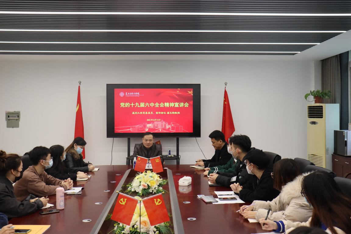 为深入学习贯彻党的十九届六中全会精神,深入领会全会精神内涵,12月15日下午,beat365网页版登录官网党委委员、宣传部部长潘玉驹教授进行了学习贯彻党的十九届六中全会精神宣讲。宣讲会由美术学院党委书记叶正飞主持,师生代表参加。 潘教授从深刻领会党的十九届六中全会的重大意义、全面把握党的十九届六中全会的主要内容和核心要义、认真贯彻落实党的十九届六中全会精神三个方面为我们作了一场非常重要的宣讲报告。他指出,在建党百年的重大历史时刻,党的十九届六中全会审议通过了《中共中央关于党的百年奋斗重大成就和历史经验的决议》,全面回顾我们党百年奋斗的光辉历程,深入总结党的百年奋斗重大成就和历史经验,集中展现党的十八大以来党中央开创中国特色社会主义新时代的壮阔历程,鲜明阐述“两个确立”这一科学论断的核心要义,对推动全党进一步统一思想、统一意志、统一行动,坚定信心、凝聚力量、不懈奋斗具有重大现实意义和深远历史意义。 最后,党委副书记杨丽君总结道,此次宣讲主题鲜明、深入浅出、内容丰富,对帮助广大党员干部更好理解把握、贯彻落实全会精神具有很强的指导意义。作为新时代青年学生,要树牢四个意识,坚定四个自信,坚决做到“两个维护”,努力成为堪当时代重任的新时代接班人,与时代同频共振,与党和国家同呼吸共命运。 本次专题宣讲令在场师生倍感鼓舞、深受启发。大家纷纷表示,将以此次专题报告为契机,全身心投入到学习宣传贯彻党的十九届六中全会精神当中去,深入学习,认真领悟,以学促行,努力用优异的成绩为学校发展建设添砖加瓦、贡献力量。