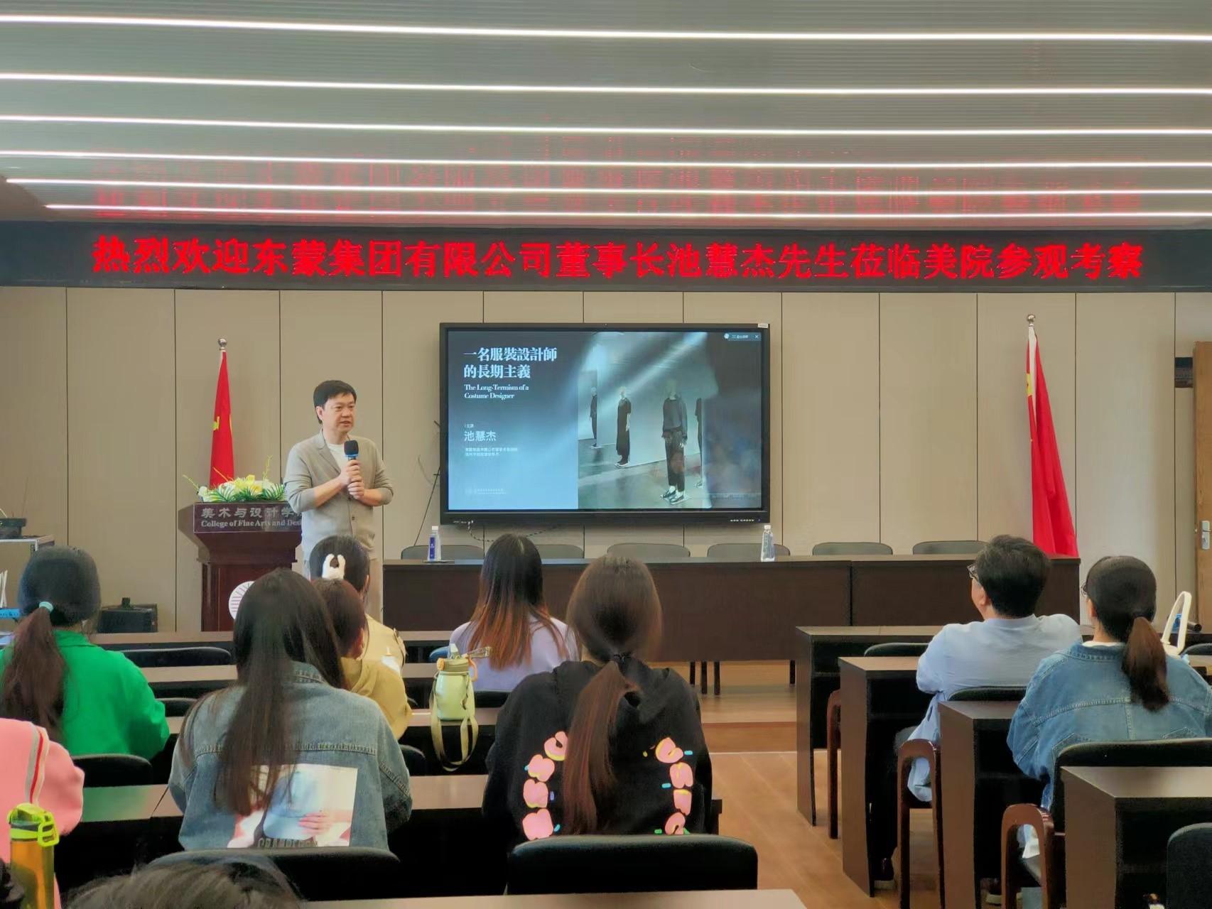近日,beat365网页版登录官网美术楼4001报告厅举行了一场题为“一名服装设计师的长期主义”的专题讲座。本次讲座由服工系高广明主任主持,东蒙集团有限公司董事长兼CEO、温州服装商会会长池慧杰先生担任主讲,胡文超副院长、姜岩教授、陈明艳教授以及服工、服饰专业30多名学生,聆听了讲座。