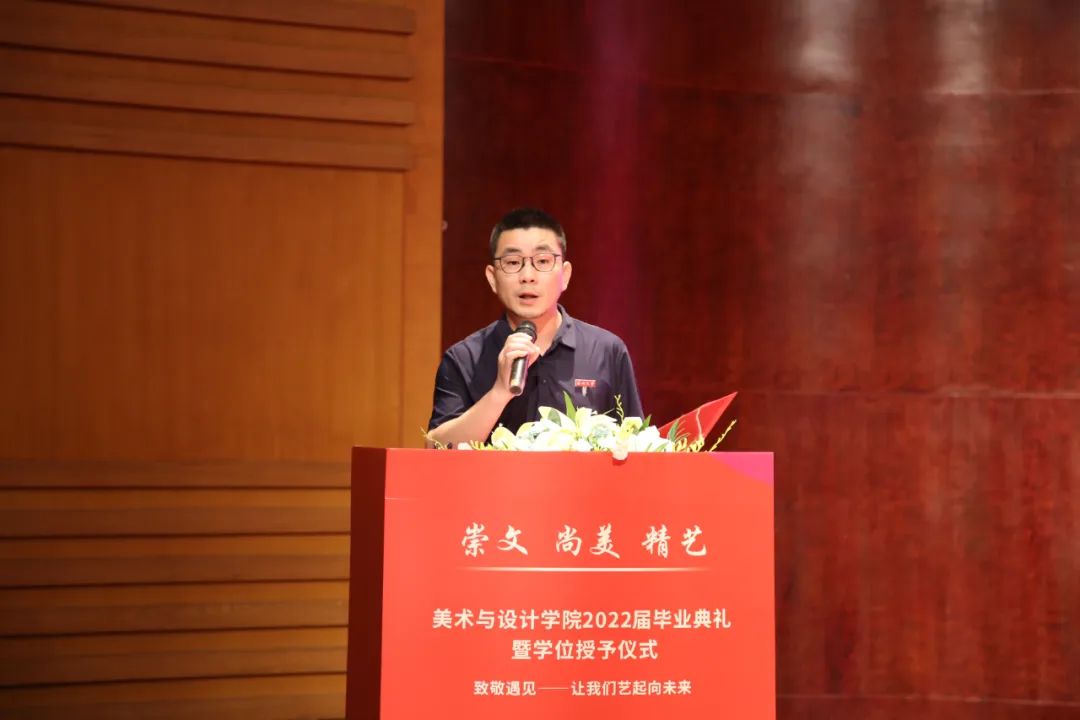班主任代表王薇老师代表美院全体老师和班主任讲话。他说道:“我希望你们的爱情是真诚的纯洁的;你们的工作是端正的认真的;你们的生活是健康的本色的。希望你们保持对生活的激情,做一个思考的人,做一个有担当的人,最重要的是要做一个快乐的、热爱生活的人。”