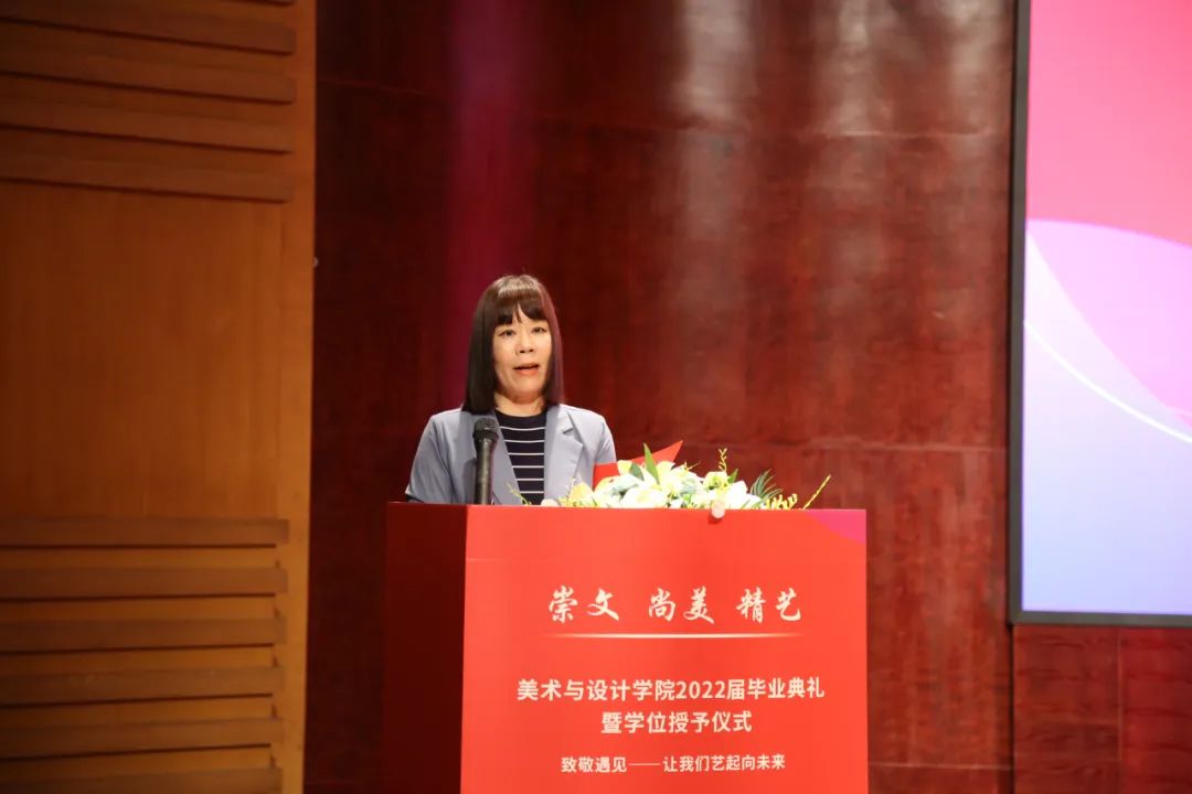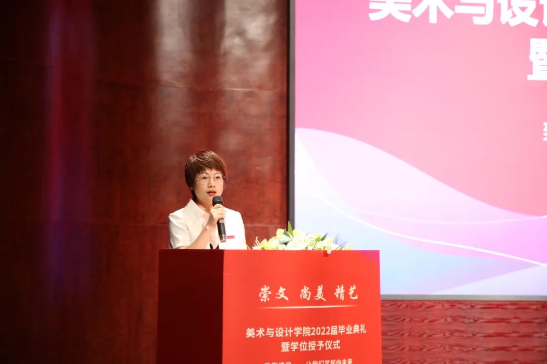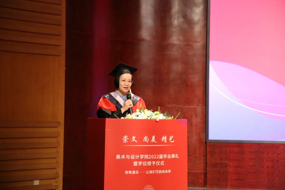 院长谢子静教授为毕业生致辞。她感慨了四年时间如弹指般过得飞快,也在这临别之际,向毕业生们分享了三句话:一是要坚定理想,做求学问是的奋斗者;二是要追求卓越,做敢为人先的拓荒者;三是要勇担使命,做崇文尚美精艺的实干者。最后,谢子静院长祝愿大家在未来的日子里,从见微知著里避免俗手、从底线思维里做好本手、从秀外慧中里做好妙手。同时也叮嘱大家,“人生海海、山山而川,将来你们无论身处何方,学院会一直关注你们、牵挂你们,学院是你们永远的港湾!”