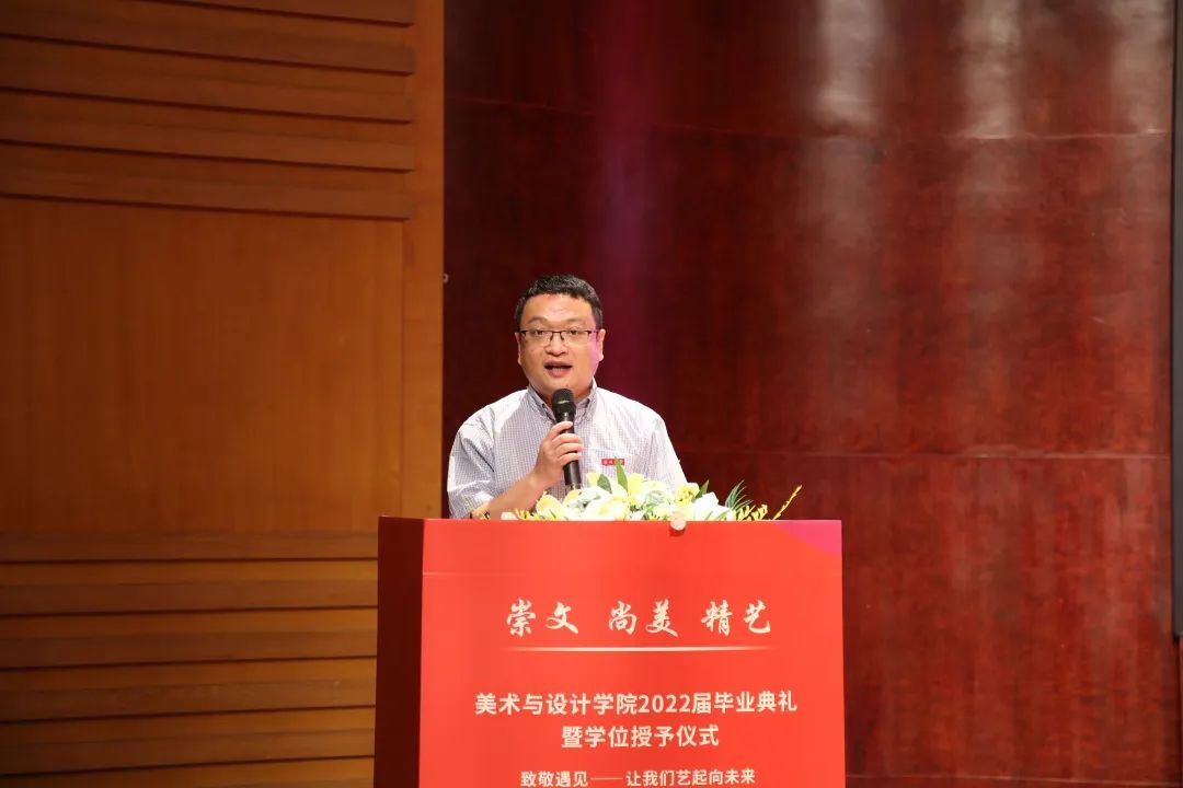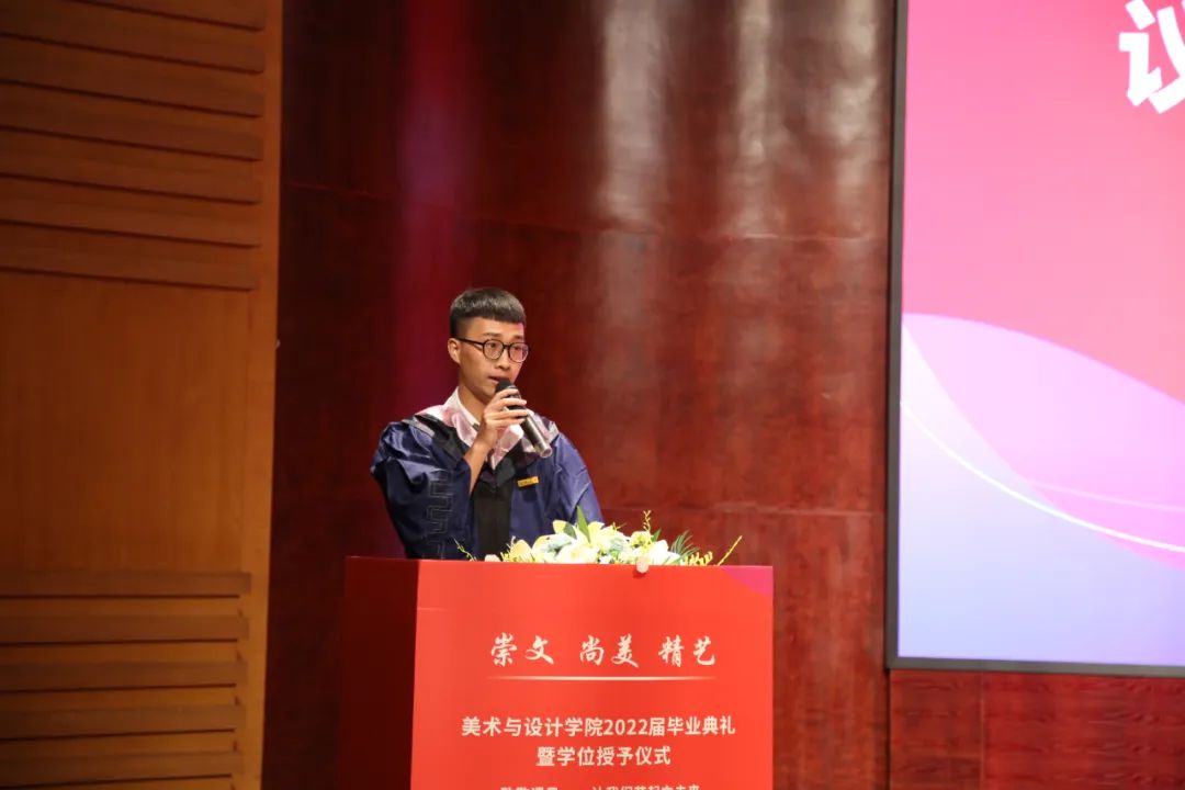 大一,是青涩与彷徨。大二,是觉醒与呐喊。大三,是奋进与拼搏。大四,却是不舍与惜别。回首望去这四年,往日的酸甜苦辣都留在了这美丽的校园中。路,一直在走,带着感动和感激,毕业学子们将满载自信而行!毕业了,也许他们即将远行,可不忘的是大学四年难忘岁月带给他们的一切。一幕幕的场景就像一张张绚烂的剪贴画,串联成一部即将谢幕的电影,播放着快乐和忧伤,记录着毕业前的青春和过往,这四年,不仅收获了友谊爱情,也收获了希望!2022年6月22日上午十点,“致敬遇见——让我们艺起向未来”beat365网页版登录官网2022届毕业生毕业典礼暨学位授予仪式于南校音乐厅隆重举行。在慷慨激昂的国歌中,2022届毕业生毕业典礼暨学位授予仪式拉开帷幕。院长谢子静教授为毕业生致辞。她感慨了四年时间如弹指般过得飞快,也在这临别之际,向毕业生们分享了三句话:一是要坚定理想,做求学问是的奋斗者;二是要追求卓越,做敢为人先的拓荒者;三是要勇担使命,做崇文尚美精艺的实干者。最后,谢子静院长祝愿大家在未来的日子里,从见微知著里避免俗手、从底线思维里做好本手、从秀外慧中里做好妙手。同时也叮嘱大家,“人生海海、山山而川,将来你们无论身处何方,学院会一直关注你们、牵挂你们,学院是你们永远的港湾!”班主任代表王薇老师代表美院全体老师和班主任讲话。他说道:“我希望你们的爱情是真诚的纯洁的;你们的工作是端正的认真的;你们的生活是健康的本色的。希望你们保持对生活的激情,做一个思考的人,做一个有担当的人,最重要的是要做一个快乐的、热爱生活的人。”毕业生代表聂枭雄、倪千茜同学发言。他们回忆了大学数年在温大的学习与生活经历,并表达了毕业生们即将离开的不舍和即将高飞的凌云壮志。精彩绝伦的发言引起了在场其他毕业生们的共鸣,掌声久久回荡在在场的每一位同学的心中。接下来,党委副书记叶如芳老师宣读了2022届“省级优秀毕业生”名单,并由党委书记叶正飞老师颁奖。副院长顾任飞老师宣读“2022届毕业生校友联络员”名单,并由2018级美院全体班主任为他们颁发聘书。毕业生们和老师互送礼物与祝福。师生情深,依依不舍、欲说还休!真挚地祝愿每一位同学带着学校和老师们的祝福奔赴前程、前程似锦!石建林老师带领2022届全体毕业生进行“廉洁从业倡议书“宣誓仪式。副院长胡文超老师宣读学位授予决定。院长谢子静教授为全体2022届毕业生进行学位授予仪式,执“拨穗礼”,并合影留念。仪式结束,全体师生一齐奏唱校歌。“大哉师道天下尊,承往哲兮启后人。厚培德本,深濬智源,学成致用教化谆……”全体师生齐唱校歌。在歌声中,美院全体毕业生正式告别镌刻着他们青春足迹的温大校园,迈向更大、更高、更远的人生舞台,全体美院毕业生必将秉承“崇文、尚美、精兿”的院训,争做堪当民族复兴重任的时代新人,创造属于自己的、温大的荣光。随着毕业典礼的顺利落幕,万语千言凝结于此,四年前,你们从四面八方而来,与温大结缘、以美院为家,明天,你们将奔赴祖国各地,以温大为荣,展美院风采。你们永远都是美院最好的校友,永远都是美院最宝贵的学子,无论走到哪里,无论在什么岗位,请莫忘你们身后还有母校和学院殷切的希望、师长们期盼的眼光,衷心祝愿美院2022届毕业生毕业快乐。