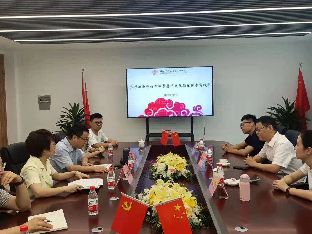 7月4日,校党委委员、组织部部长郑信军一行人来到beat365网页版登录官网看望慰问“鞋蕴传承”暑期社会实践队。在座谈会上,学院党委副书记叶如芳主持,鞋蕴传承实践队队长田锦源介绍了实践情况,展示了实践三天以来队员们实践进度与成效,并介绍了未来几天实践队的计划与目标,慰问中,郑信军部长还向实践队同学们赠送了慰问品,为实践队送来夏日里的温暖关怀。