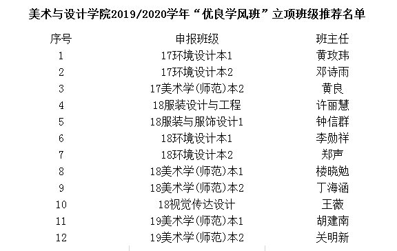 根据beat365网页版登录官网2019/2020学年“优良学风班”立项申报工作的通知要求,经班级申报、学院初步审核,现决定对17环境设计本1等12个班级进行立项推荐,现将结果予以公布。
